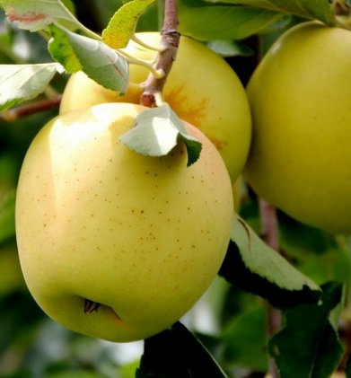 A fruta éa “Maçã Dourada”, uma maçã alongada de tamanho médio,
