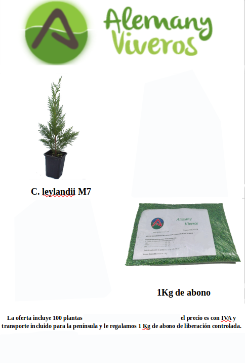 - Cupressocyparis leylandii:(PLANTA ESPECIAL PARA SEBES, NÃO CONFUNDIR COM O CIPRESTE COMUM OU CUPRESSUS SEMPERVIRENS). Apresentam-se em vasos quadrados de 7x7x8 cm, com altura aproximada de 30 cm.(Sem contar o vaso de flores)Esta planta é ideal para criar uma cerca viva alta e densa em um curto espaço de tempo, crescendo até um metro por ano se o solo for bem fertilizado. Deve ser plantada a uma distância recomendada de 70 cm entre plantas para obter uma cerca viva compacta em pouco tempo.